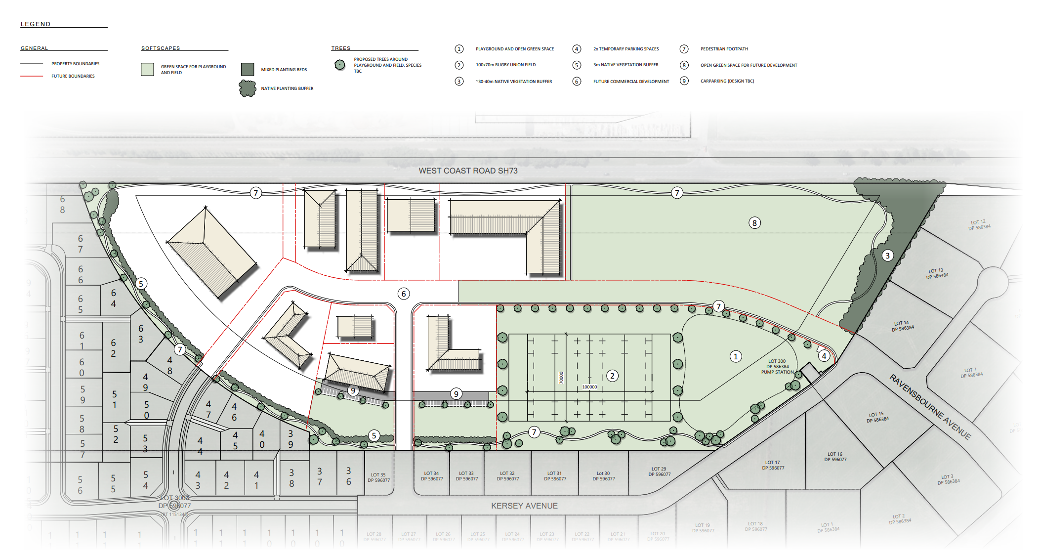We all thought we were purchasing properties that adjoined an expansive central park with a small commercial hub off to one side. Not to mention a fantastic view of the Southern Alps like the one in the site banner.